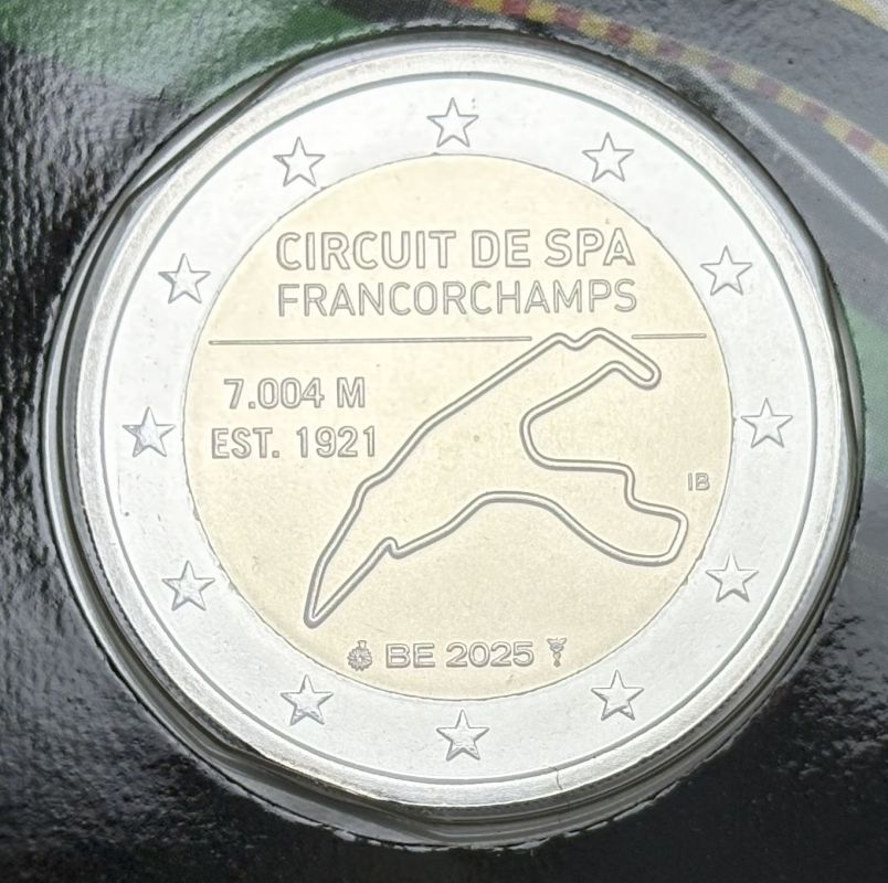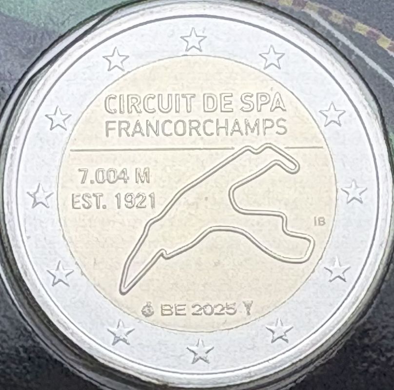 Mittig der aktuelle Verlauf des Rundkurses. Linkerhand ist die Gesamtlänge des Rundkurses „7.004 M“ angegeben, sowie das Jahr der Errichtung, „1921“. Oberhalb der Streckendarstellung ist der Ausgabeanlass „CIRCUIT DE SPA FRANCORCHAMPS“ zu sehen. Am unteren Bildrand sind der Ländercode „BE“ und das Ausgabejahr „2025“ abgebildet, begleitet von den Prägezeichen der Koninklijke Nederlandse Munt und des amtierenden belgischen Münzmeisters Giovanni Van de Velde. Rechterhand die Initialen „IB“ der Münzdesignerin Iris Bruijns.